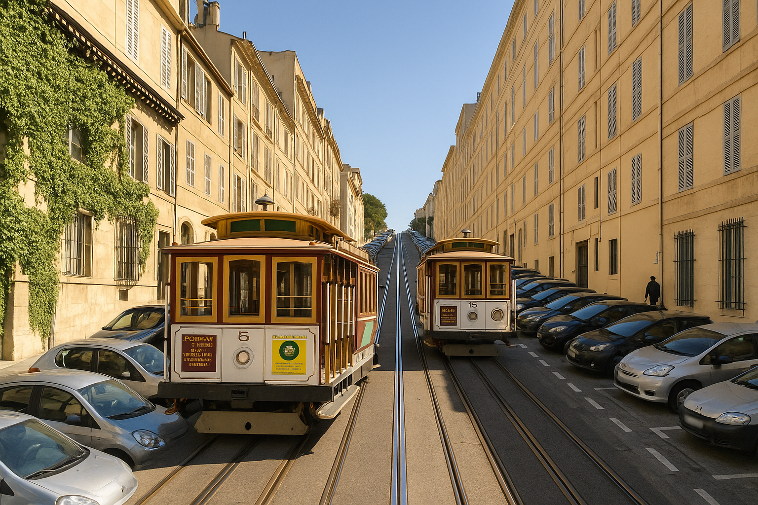 Pour en finir avec les bus sur la colline et réparer l’erreur historique qu’a été la disparition du ascenseur/funiculaire de la rue Dragon en 1967. Le boulevard André Aune pourrait accueillir une infrastructure facile à mettre en place qui a déjà fait ses preuves ailleurs… Sur environ 600m et avec 14% de pente moyenne, ce moyen de transport peut devenir iconique pour les Marseillais et ses visiteurs. Plus qu’une simple attraction touristique, ce cable car permettra d’apaiser tout un quartier.